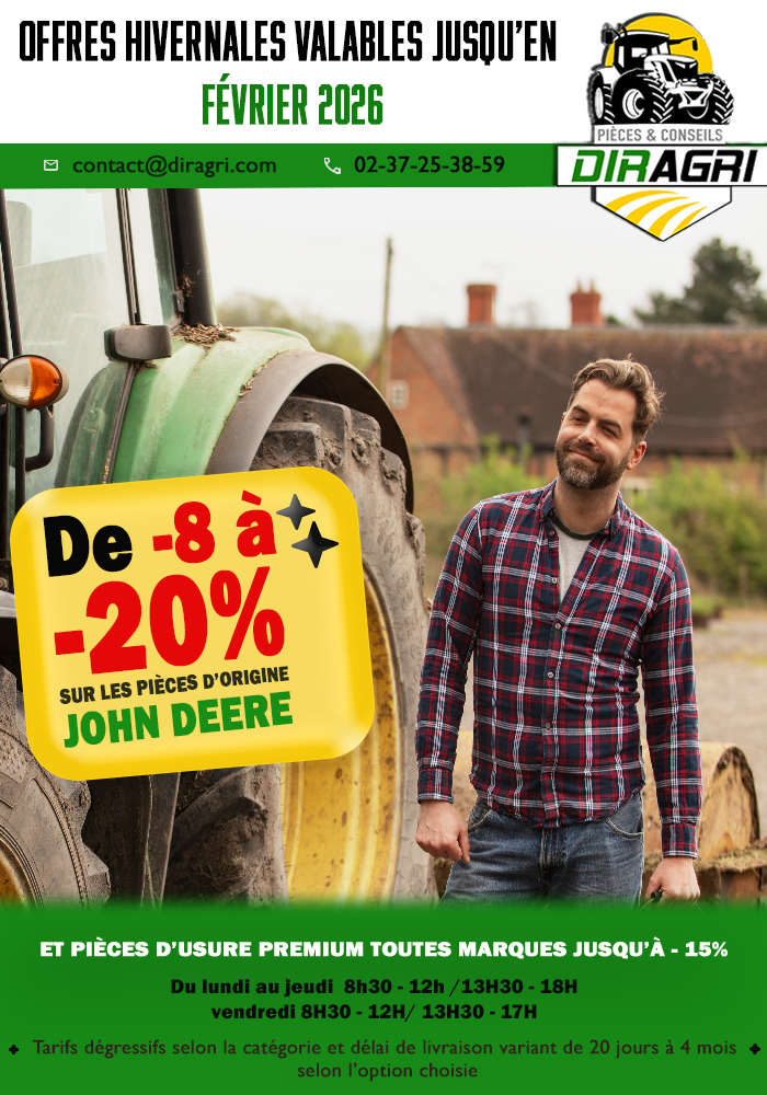 Bénéficiez jusqu'à 20% de remise sur les pièces d'origine John Deere (suivant catégories et délai de livraison),